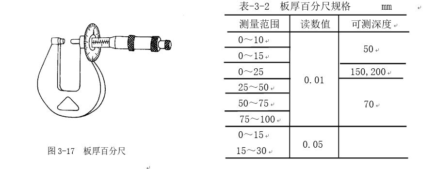 板厚百分尺如圖3-17所示。主要適用于測量板料的厚度尺寸。其規(guī)格見表3-2。
