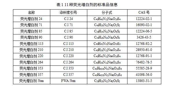 本方法規(guī)定了食用菌、大米、小麥粉和小麥粉制品、淀粉和淀粉制品中11種二苯乙烯類陰離子型熒光增白劑的高效液相色譜測定方法。11種熒光增白劑包括熒光增白劑24、熒光增白劑71、熒光增白劑85、熒光增白劑90、熒光增白劑113、熒光增白劑210、熒光增白劑220、熒光增白劑264、熒光增白劑353、熒光增白劑357、熒光增白劑5bm。