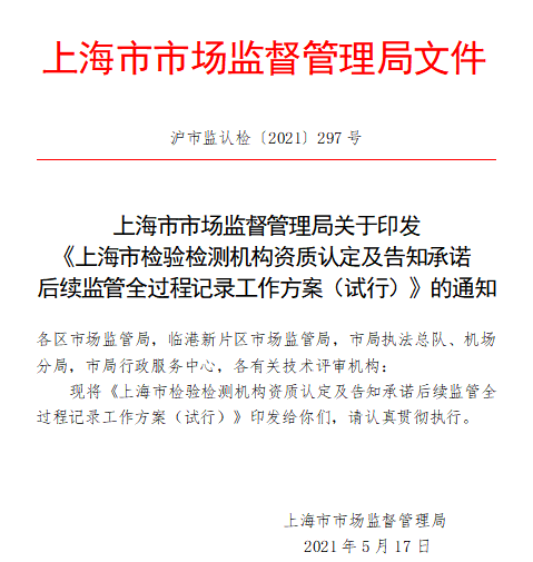 上海市檢驗檢測機構(gòu)資質(zhì)認(rèn)定及告知承諾后續(xù)監(jiān)管全過程記錄工作方案(試行)
