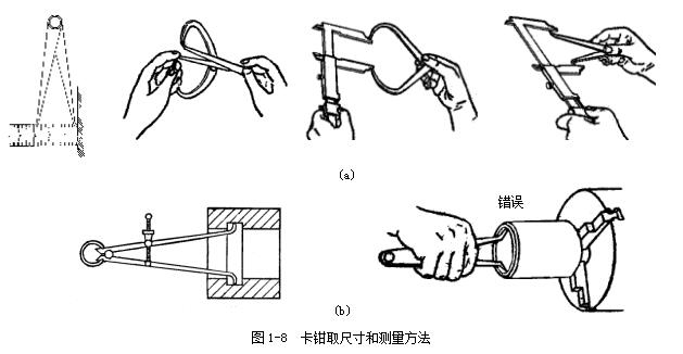 用巳在鋼直尺上或在外卡鉗上取好尺寸的內(nèi)卡鉗去測量內(nèi)徑,圖1-8a 所示。就是比較內(nèi)卡鉗在零件孔內(nèi)的松緊程度。如內(nèi)卡鉗在孔內(nèi)有較大的自由擺動時(shí),就表示卡鉗尺寸比孔徑內(nèi)小了;如內(nèi)卡鉗放不進(jìn),或放進(jìn)孔內(nèi)后緊得不能自由擺動,就表示內(nèi)卡鉗尺寸比孔徑大了,如內(nèi)卡鉗放入孔內(nèi),按照上述的測量方法能有1~2mm的自由擺動距離,這時(shí)孔徑與內(nèi)卡鉗尺寸正好相等。測量時(shí)不要用手抓住卡鉗測量,圖1-8b 所示,這樣手感就沒有了,難以比較內(nèi)卡鉗在零件孔內(nèi)的松緊程度,并使卡鉗變形而產(chǎn)生測量誤差。