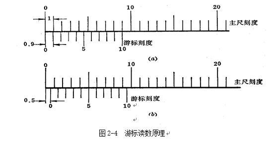 如圖2―4(a)所示,主尺刻線間距(每格)為1mm,當(dāng)游標(biāo)零線與主尺零線對(duì)準(zhǔn)(兩爪合并)時(shí),游標(biāo)上的第10刻線正好指向等于主尺上的9mm,而游標(biāo)上的其他刻線都不會(huì)與主尺上任何一條刻線對(duì)準(zhǔn)。