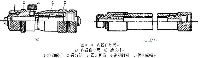 內(nèi)徑百分尺如圖3-10a所示,其讀數(shù)方法與外徑百分尺相同。內(nèi)徑百分尺主要用于測量大孔徑,為適應不同孔徑尺寸的測量,可以接上接長桿(如圖3-10b)。連接時,只須將保護帽5旋去,將接長桿的右端(具有內(nèi)螺紋)旋在百分尺的左端即可。接長桿可以一個接一個地連接起來,測量范圍最大可達到5000mm。內(nèi)徑百分尺與接長桿是成套供應的。目前,國產(chǎn)內(nèi)徑百分尺的測量范圍(mm)