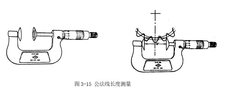 公法線長度千分尺如圖3-15所示。主要用于測量外嚙合圓柱齒輪的兩個不同齒面公法線長度,也可以在檢驗切齒機床精度時,按被切齒輪的公法線檢查其原始外形尺寸。它的結(jié)構(gòu)與外徑百分尺相同,所不同的是在測量面上裝有兩個帶精確平面的量鉗(測量面)來代替原來的測砧面。