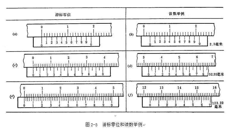 在圖2―5(f)中,游標(biāo)零線在123mm與124mm之間,游標(biāo)上的11格刻線與主尺刻線對準(zhǔn)。所以,被測尺寸的整數(shù)部分為123mm,小數(shù)部分為11×0.02=0.22(mm),被測尺寸為123十0.22=123.22(mm)。